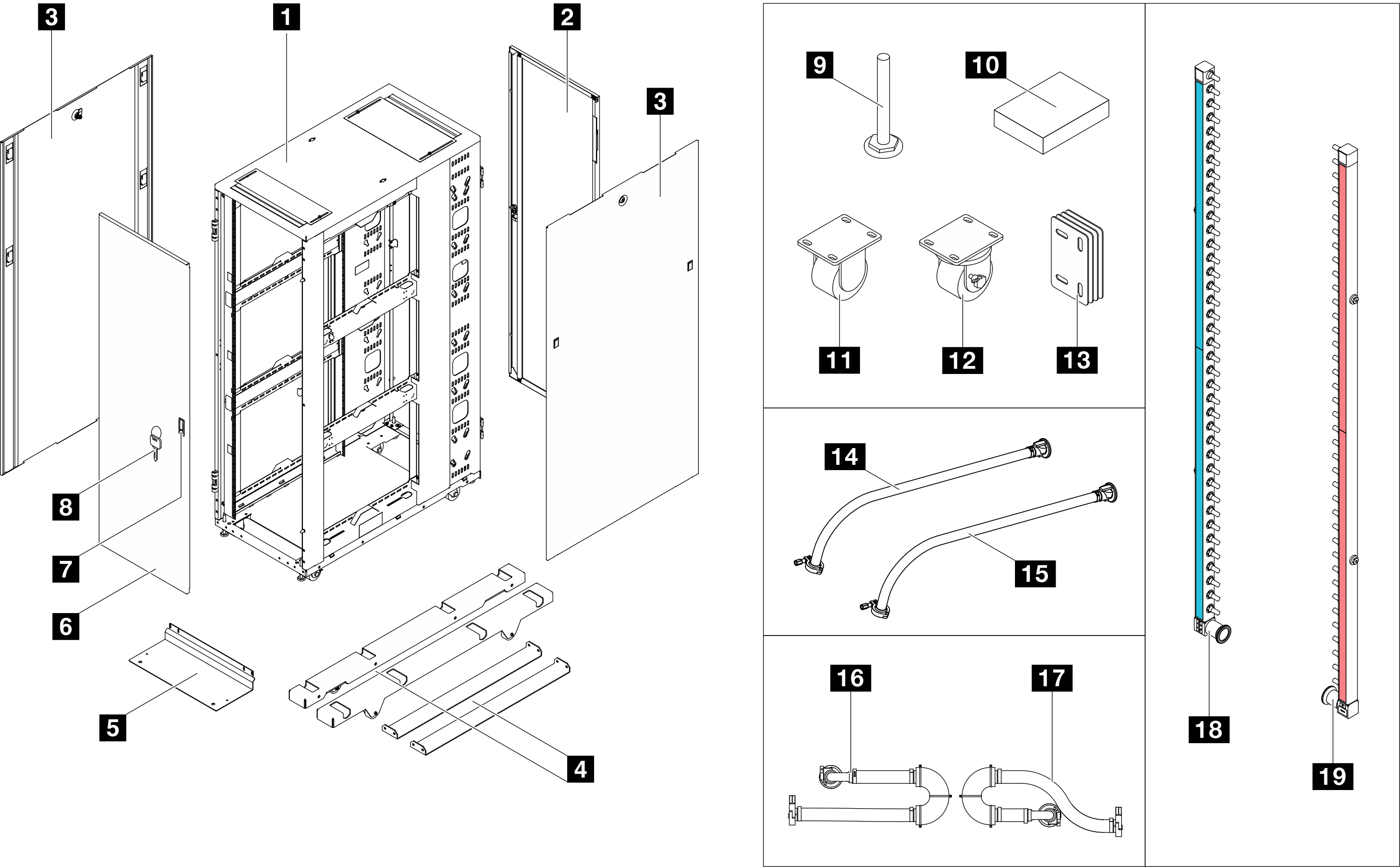 Consultare questo argomento per informazioni sulle parti di ThinkSystem Heavy Duty Full Depth 42U Rack Cabinet.
