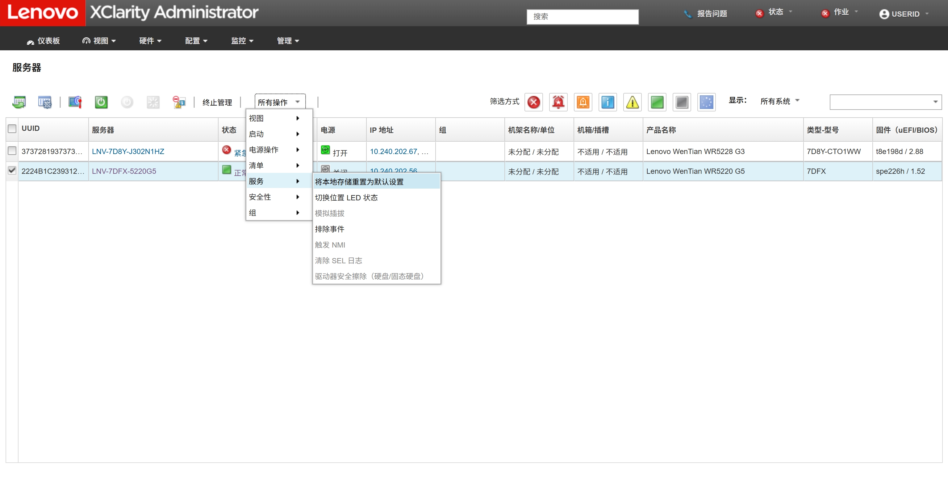 使用 LXCA cPlus清除外部配置清除外部配置创建 RAID 逻辑盘时,如果存在外部配置(外键, 也称为 foreign config),会导致创建失败。需要通过该操作先清除外部配置,再进行创建可成功创建逻辑盘。在 LXCA cPlus 用户界面主页面,点击硬件,点击服务器,进入服务器操作页面。在服务器列表中需要执行该操作的设备,点击所有操作,点击服务,点击将本地存储重置为默认状态。Give documentation feedback