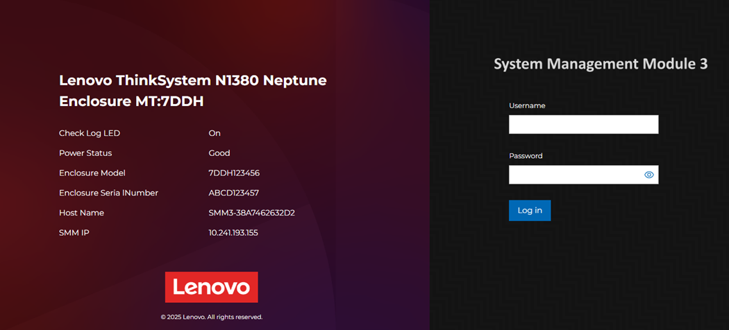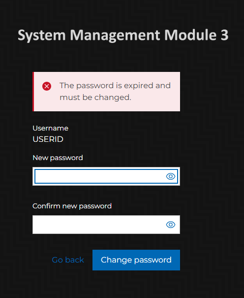 - ユーザー名とパスワード (システム管理者が割り当てたもの) を SMM3 のログイン・ウィンドウに入力します。SMM3 は、最初はユーザー名 USERIDとパスワード PASSW0RD (英字の O でなくゼロ) を使用して設定されています。次の図にログイン・ウィンドウを示します。注ユーザーは、パスワード入力ボックスの右側にある「目」アイコンをクリックして、パスワードテキストを表示または非表示にすることができます。図 1. ログイン・ページ