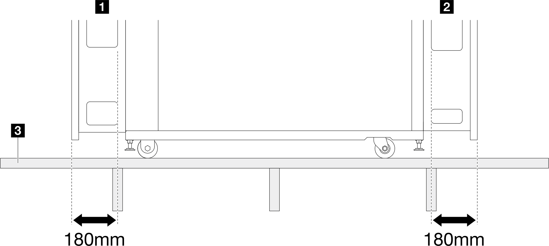 Wenn das Rack mit N1380 Gehäusen bestückt wird, empfiehlt es sich, dass das Rack auf einer Fläche von zwei 600 x 600 mm großen Bodenfliesen steht. Die vordere und hintere Erweiterung des Racks mit Rack-Türen ragt 180 mm über die belegte Bodenfliesenfläche hinaus.