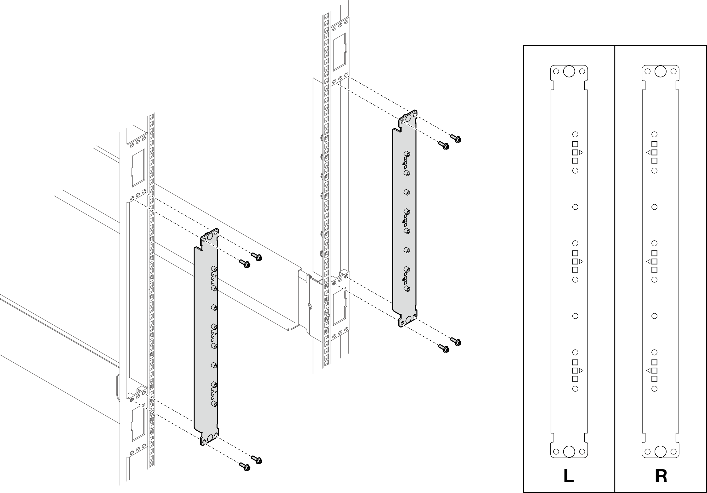 (Optional) Entfernen Sie vier Schrauben an jeder Rackstütze, um die Erweiterungssätze von den Rackstützen zu lösen. Entfernen Sie die Erweiterungssätze aus dem Rack.