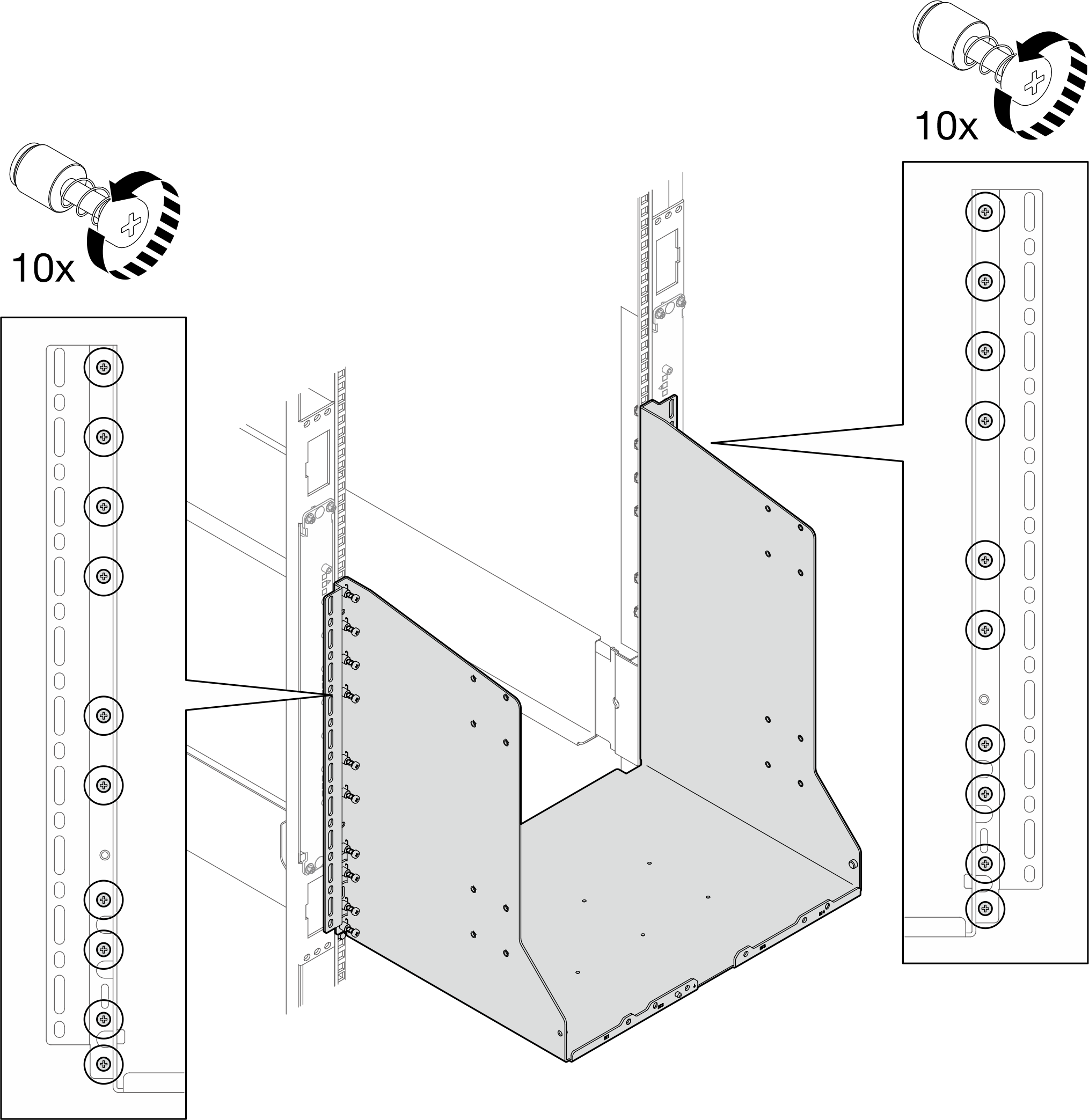 Lösen Sie die zehn Schrauben an jeder Rackstütze, um die hintere Halterung vom Rack zu lösen.