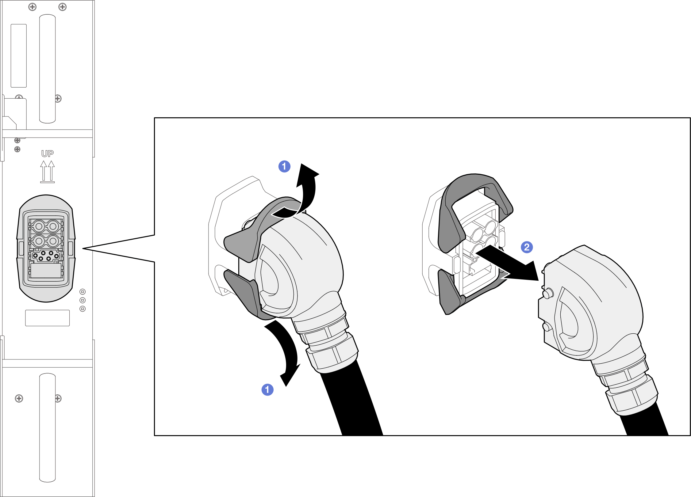 Les procédures ci-dessus couvrent uniquement la solution Lenovo DWC (depuis les soupapes Eaton Ball via le distributeur et à l’intérieur des boîtiers et des plateaux). Si l’unité de distribution de refroidissement de votre centre de données émet des alertes de faible niveau d’eau fréquemment ou de manière répétée, inspectez les tuyaux du centre de données qui relient l’unité de distribution de refroidissement à la solution Lenovo DWC (armoire).