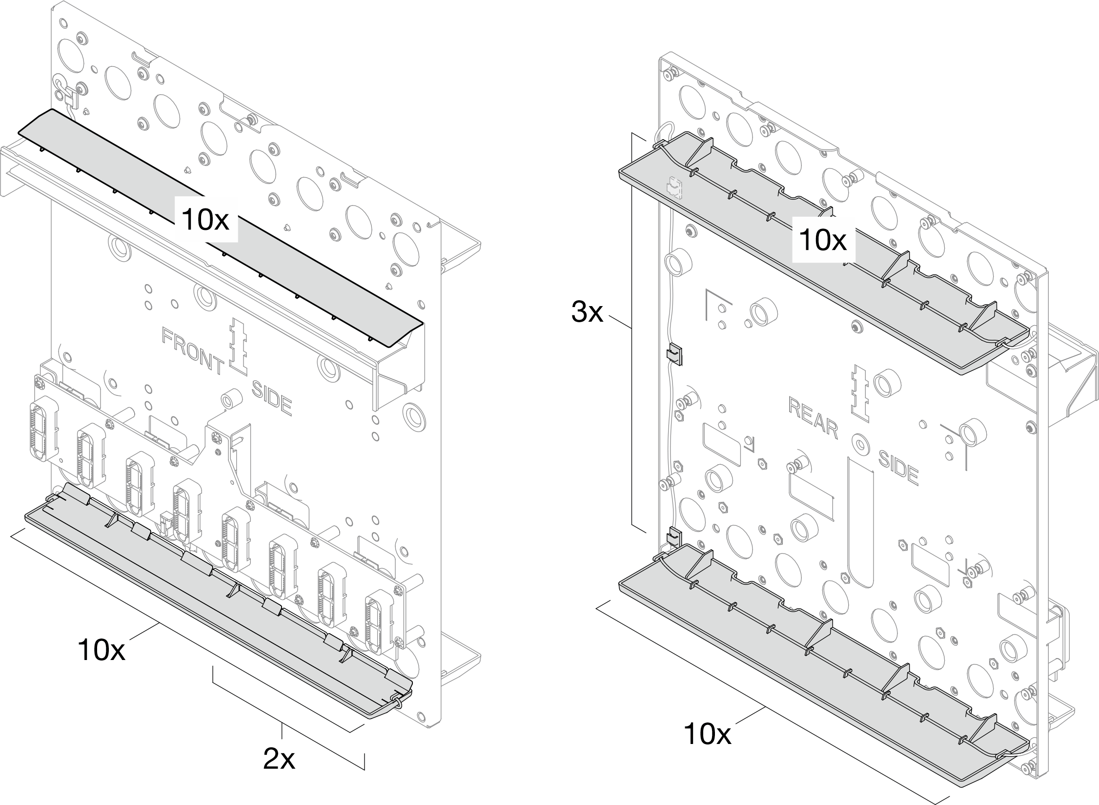エンクロージャー前面にすべてのトレイを取り付けます。エンクロージャーへのトレイの取り付けを参照してください。