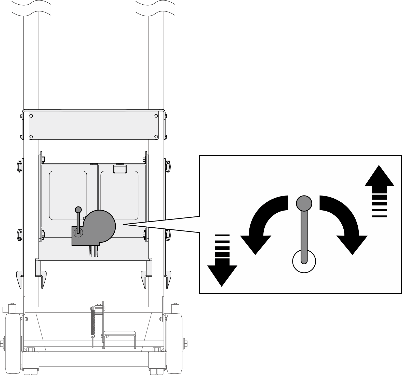 リフト・ツール固定具が取り付けられた Genie GL-8 リフト・ツール。フットリリースブレーキは、リフト・ツールにも取り付ける必要があります。