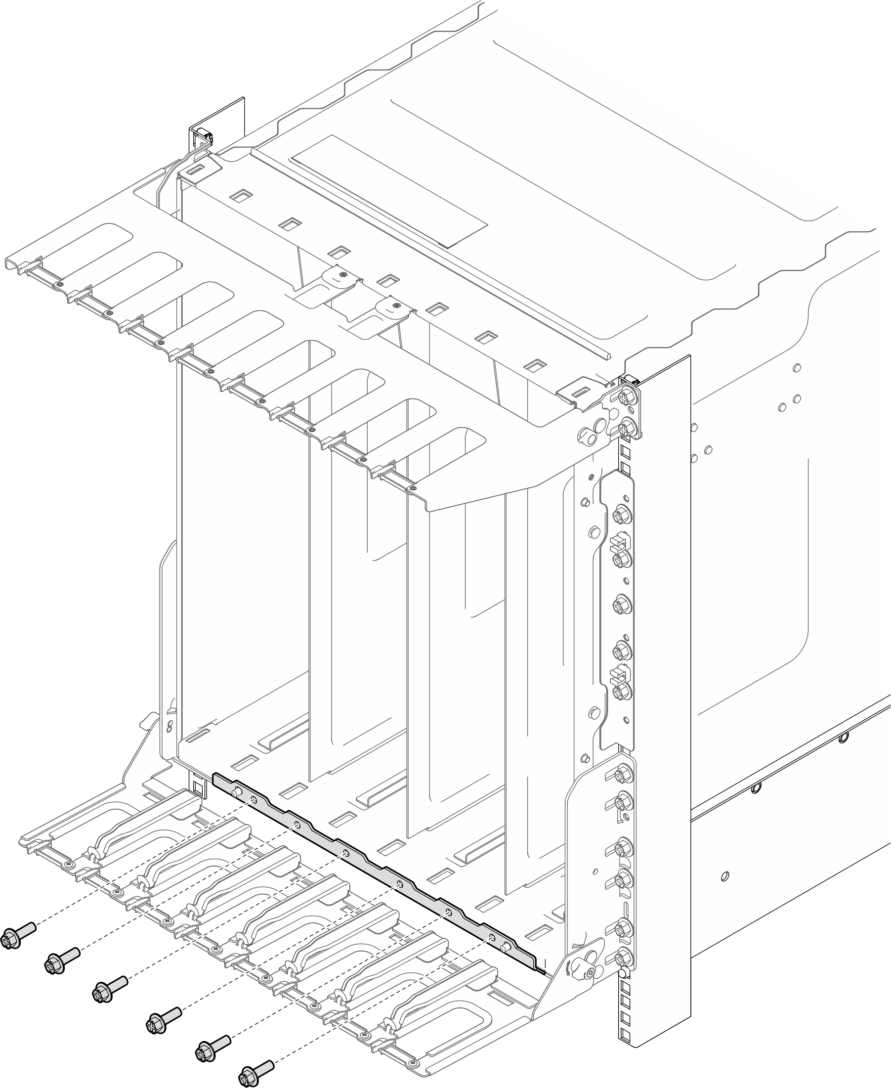 - 나사 6개를 제거하여 엔클로저 앞쪽 끝에서 하단 지지 브래킷을 분리하십시오.