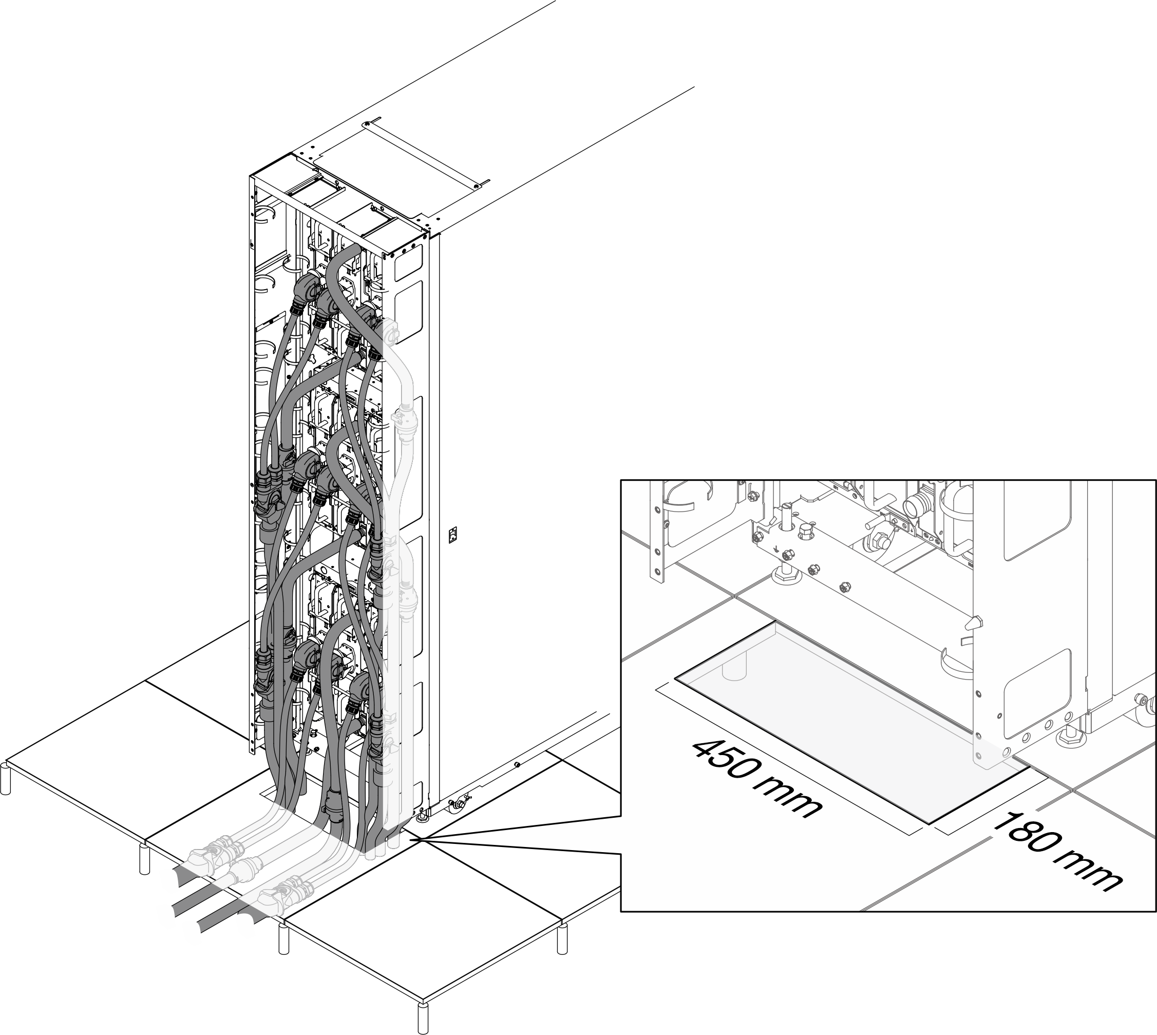 在采用地板下线缆布放的设施中,水管和/或电源线将从活动地板穿过。如果机架部署在此类设施中,建议开一个矩形地板切口,让机架的电源线和水管穿过该切口与设施的软管和电源线连接。