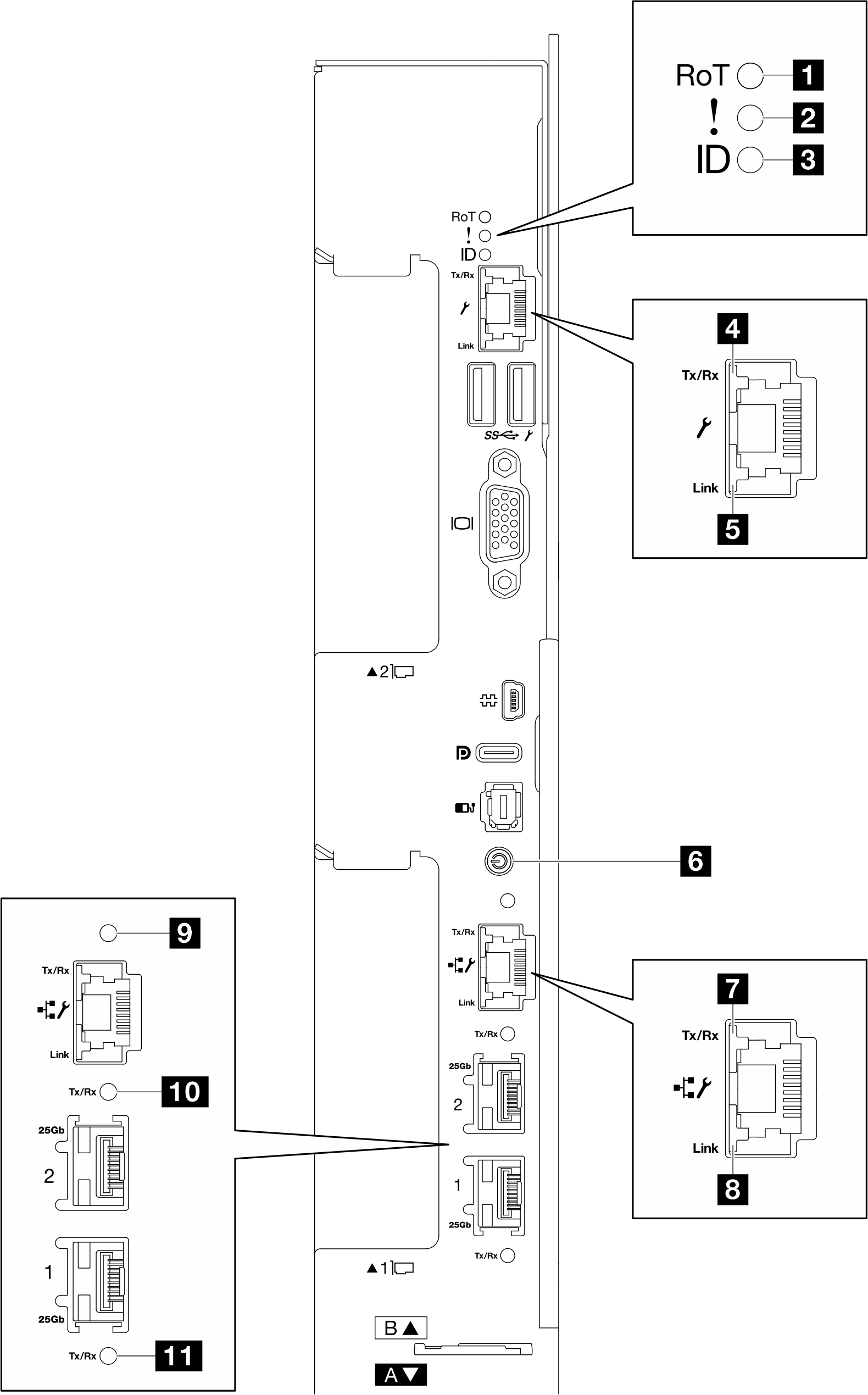 | 4 LED de actividad del conector de gestión de XCC dedicado (RJ45 de 1 Gb) (verde) | 10 LED de actividad y enlace del puerto Ethernet de 25 Gb (puerto 2) (verde) |