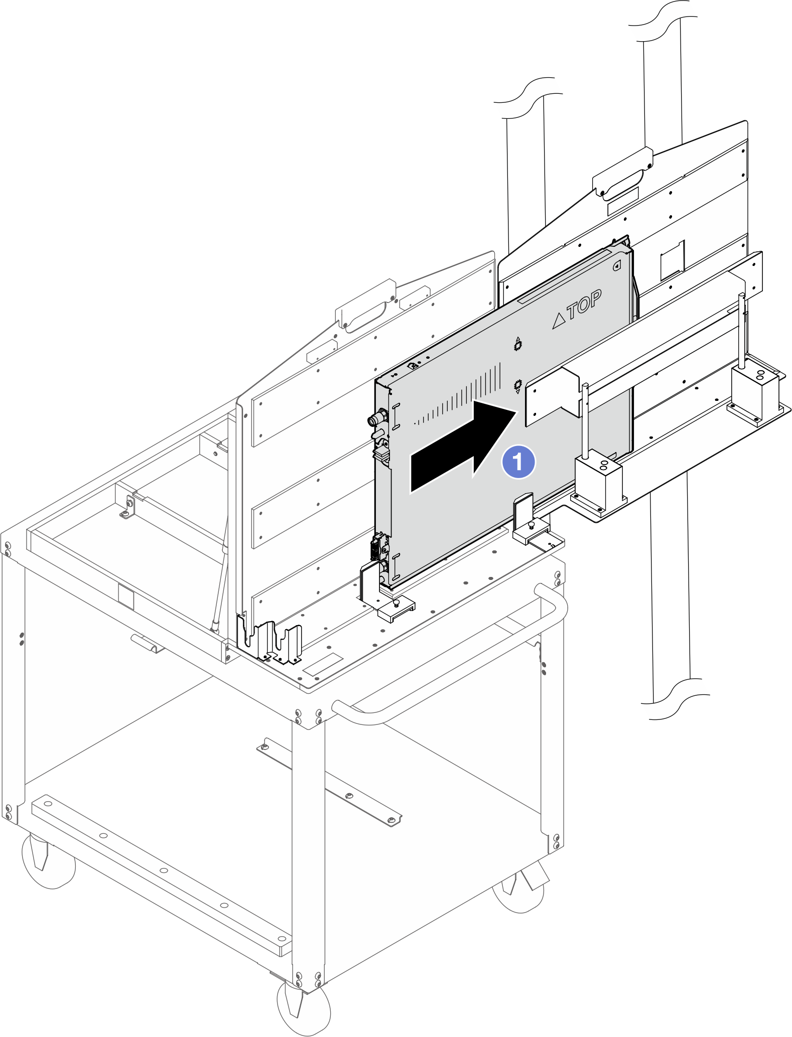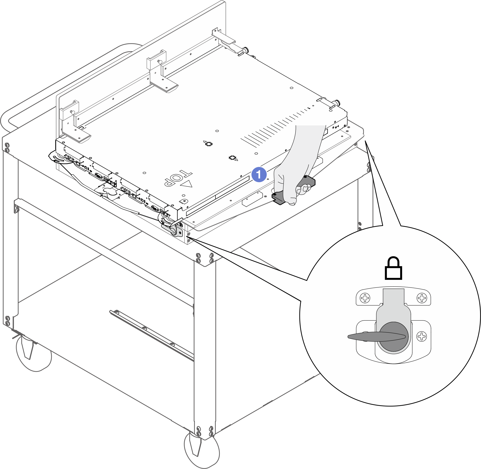Mueva el conjunto de la herramienta de elevación a la parte frontal del bastidor. Asegúrese de que la parte frontal del dispositivo esté orientada hacia la parte posterior de la bandeja.