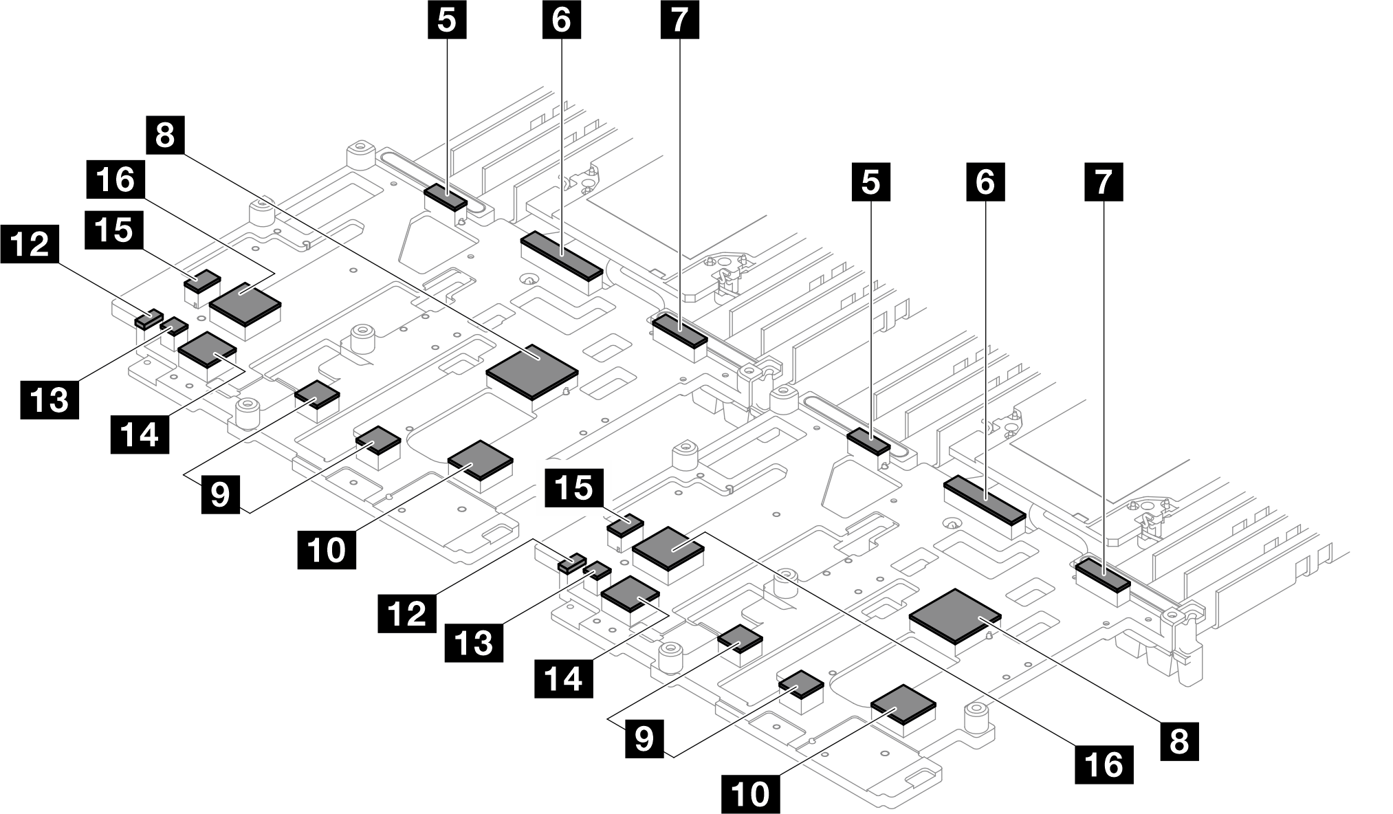 | 2 | Parte inferior de la placa de frío central E3.S | Almohadillas de espacio de un solo uso. Sustituya la almohadilla cada vez que se quite la placa de frío central E3.S. |