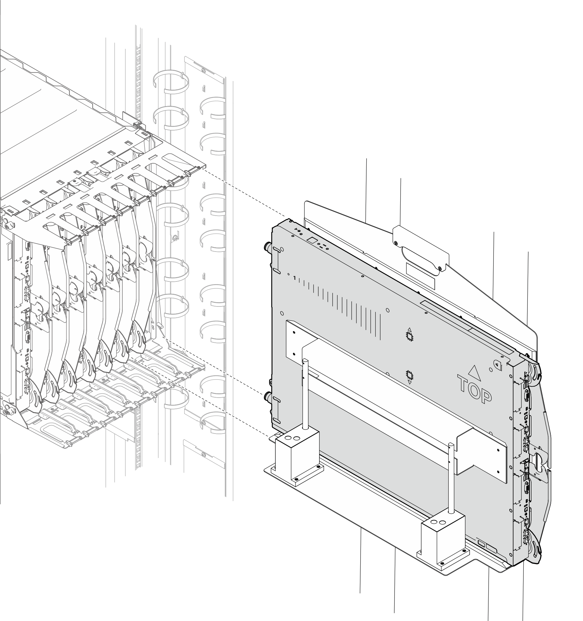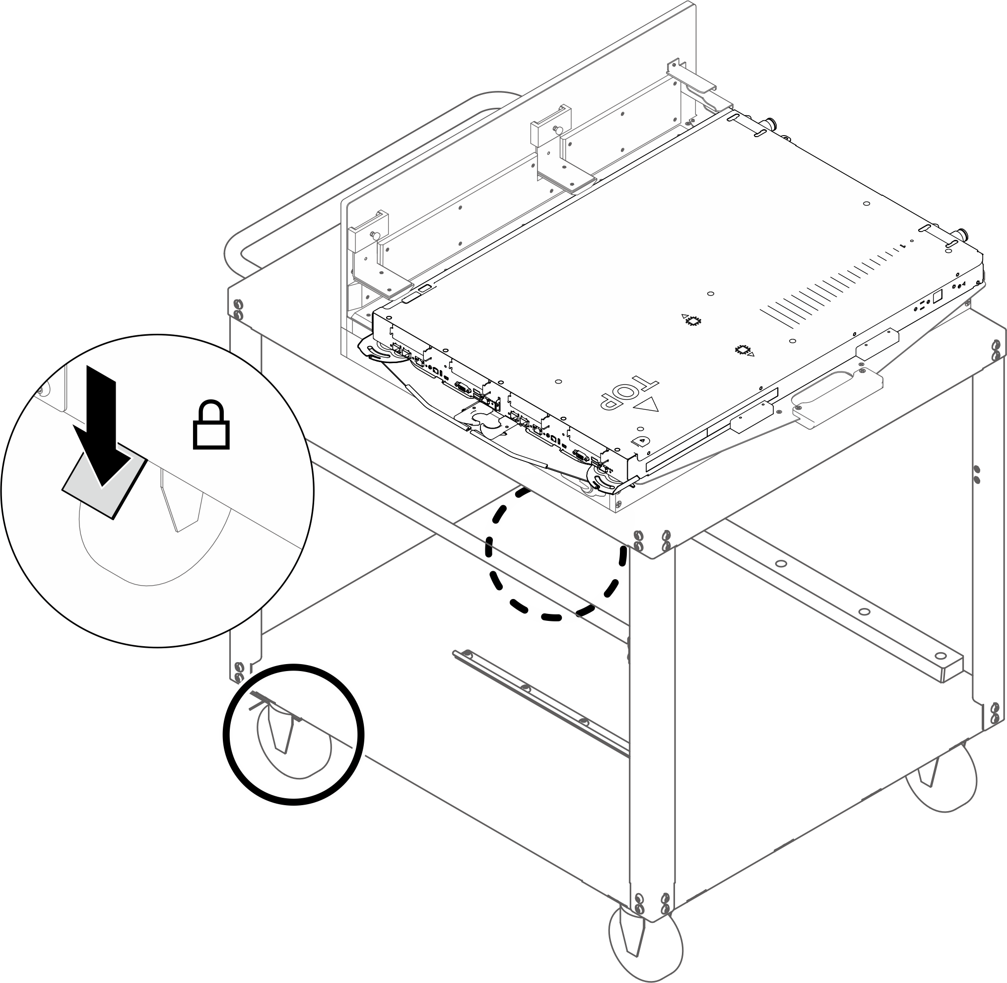 Pour des raisons de sécurité, lors du retrait d’un plateau ou d’un PCS, il est fortement recommandé d’utiliser le Genie® Lift™ GL™-8 en raison du poids du serveur. Lenovo propose le dispositif de levage avec les accessoires complémentaires Genie Lift GL-8 Option Kit et GL-8 Kit for N1380 and SC Systems. Si aucun outil de levage n’est disponible sur le site, les clients doivent déplacer la machine vers une zone accessible et alimentée en électricité avant que le technicien qualifié n’arrive et ne s’occupe de la réinstallation. Lenovo recommande fortement de configurer une solution complète pour les systèmes N1380 et SC avec l’outil de levage et ses accessoires complémentaires via des éléments non montés en armoire.