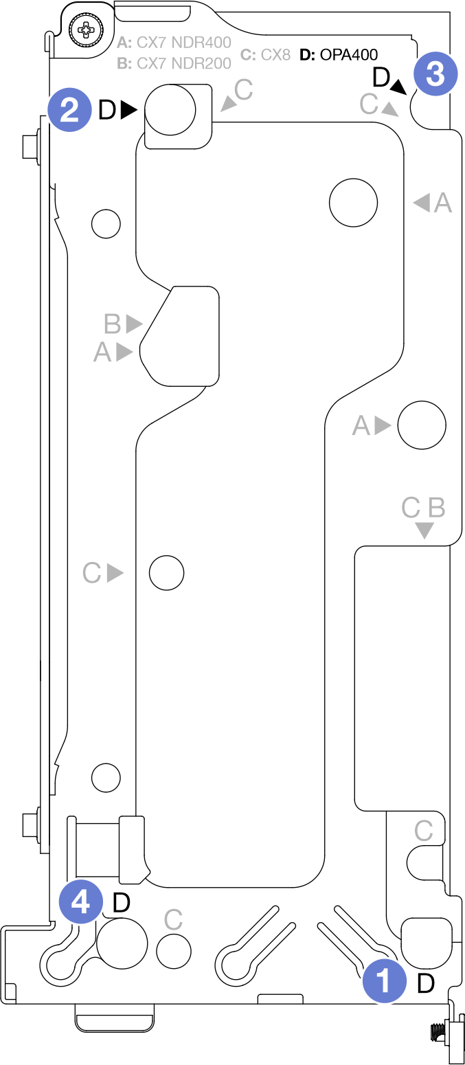 • The system supports two types of riser cages, 1 with A/B printing and 2 with A/B/C/D printing, as shown in the illustration below. Make sure to use riser cage 2 when installing the OPA 400.