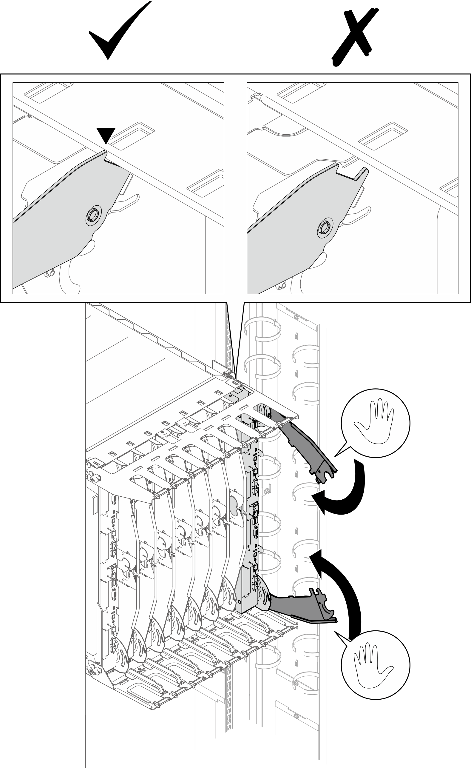 • 取り外した DWC トレイを再取り付けする場合は、取り外したときと同じトレイ・ベイに取り付ける必要があります。一部の DWC トレイ構成情報および更新オプションは、トレイ・ベイ番号に従って設定されます。DWC トレイを別のトレイ・ベイに再取り付けすると、予期しない影響がある可能性があります。DWC トレイを別のトレイ・ベイに再取り付けする場合、DWC ノードを再構成する必要がある場合があります。