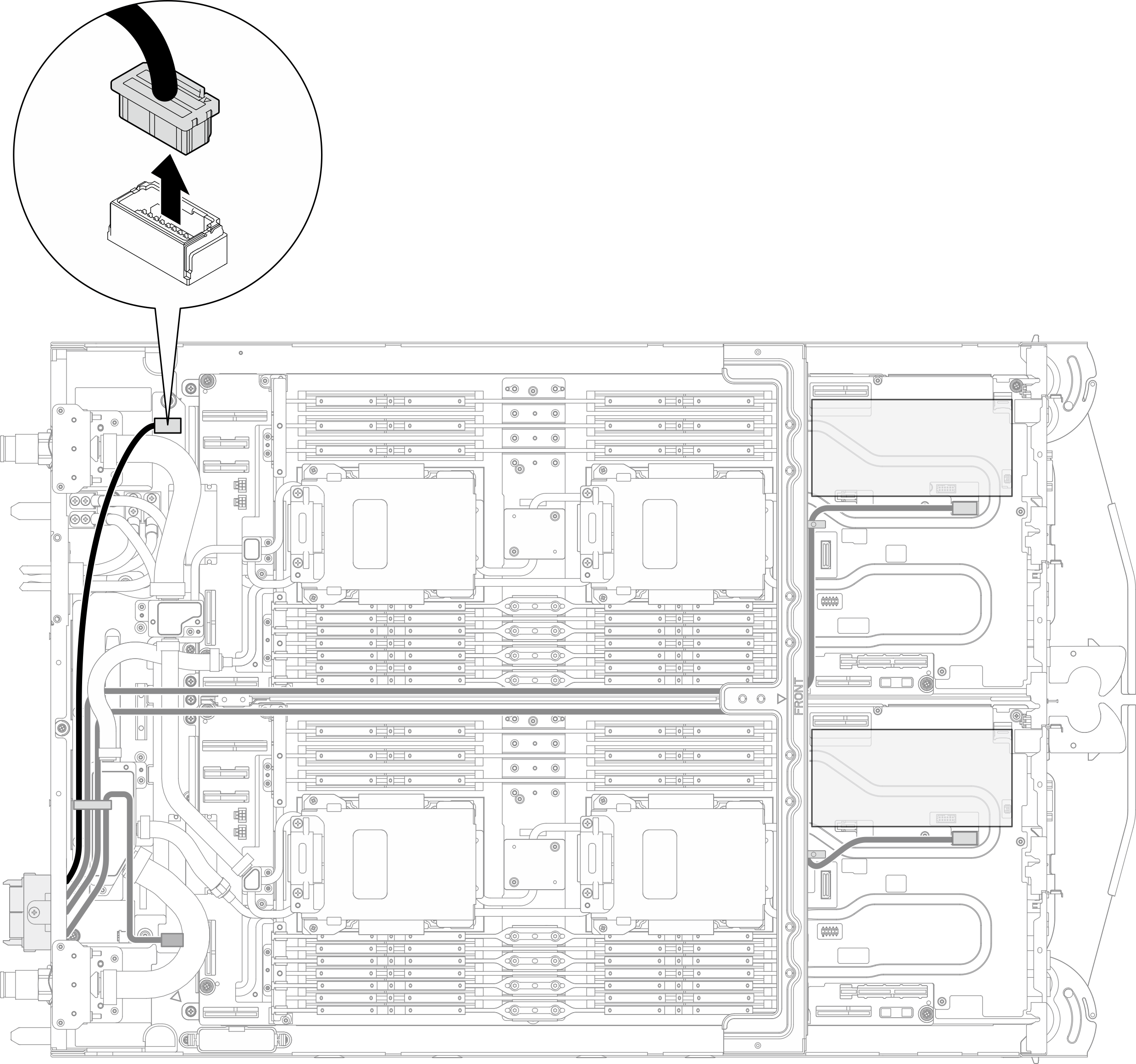 하드웨어 교체 절차트레이의 구성 요소 교체(숙련된 기술자 전용)버스 바 커넥터 모듈 교체(숙련된 기술자 전용)버스 바 커넥터 모듈 제거버스 바 커넥터 모듈 제거다음 정보를 사용하여 버스 바 커넥터 모듈을 제거하십시오.이 작업 정보필수 도구PH1 및 PH 2 나사용 드라이버주의설치 지침 및 안전 점검 목록의 안내에 따라 안전하게 작업하십시오.작업을 수행하려는 해당 DWC 트레이의 전원을 끄십시오.엔클로저에서 외부 케이블을 모두 분리하십시오.QSFP 케이블이 솔루션에 연결되어 있다면 추가로 분리하십시오.워터 루프의 손상을 방지하려면 워터 루프를 제거, 설치 또는 접을 때 항상 워터 루프 캐리어를 사용하십시오.다음 그림과 하드웨어가 조금 다를 수 있지만, 제거 방법은 동일합니다.절차 보기이 절차의 비디오는 YouTube에서 볼 수 있습니다.절차이 작업을 준비하십시오.엔클로저에서 트레이를 제거하십시오. 엔클로저에서 트레이 제거의 내용을 참조하십시오.트레이 덮개를 제거하십시오. 트레이 덮개 제거의 내용을 참조하십시오.16개의 PH1 나사를 제거하여 뒷면 십자형 브레이스를 제거하십시오.그림 1. 뒷면 십자형 브레이스 제거플러그에 P3이 표시된 사이드밴드 케이블을 PDB에서 분리하십시오.그림 2. P3 사이드밴드 케이블을 분리하십시오버스 바 커넥터 모듈을 제거하십시오. 적절한 토크로 설정된 토크 드라이버로 접지 케이블(검은색 케이블)에서 PH2 나사 4개를 제거합니다. 적절한 토크로 설정된 토크 드라이버로 전원 케이블(빨간색 케이블)에서 PH2 나사 4개를 제거합니다.주참고로 나사를 완전히 조이거나 제거하는 데 필요한 토크는 7+/- 1.0lbf-in입니다.그림 3. 버스 바 커넥터 모듈 분리 트레이 뒷면 베젤에서 PH1 나사 3개를 제거하십시오. 버스 바 커넥터 모듈을 제거하십시오.그림 4. 버스 바 커넥터 모듈 제거완료한 후구성 요소 또는 옵션 장치를 반환하도록 지시받은 경우 모든 포장 지시사항을 따르고 제공되는 운송용 포장재를 사용하십시오.피드백 보내기