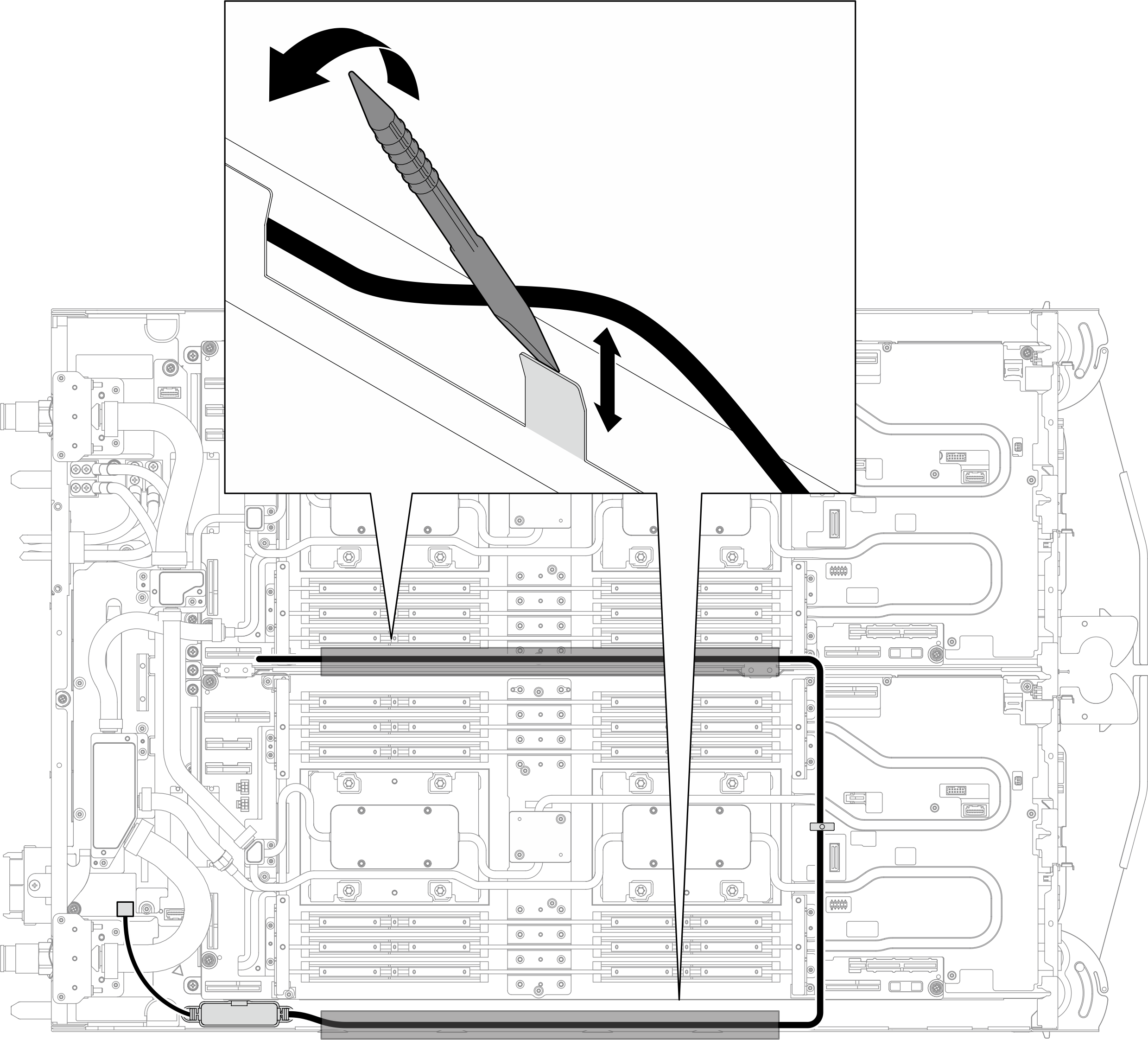 하드웨어 교체 절차트레이의 구성 요소 교체(숙련된 기술자 전용)누수 센서 모듈 교체누수 센서 제거누수 센서 제거다음 정보를 사용하여 누수 센서를 제거하십시오.이 작업 정보주의설치 지침 및 안전 점검 목록의 안내에 따라 안전하게 작업하십시오.작업을 수행하려는 해당 DWC 트레이의 전원을 끄십시오.엔클로저에서 전원 코드와 외부 케이블을 모두 분리하십시오.엔클로저에서 전원 코드를 분리하십시오.절차 보기이 절차의 비디오는 YouTube에서 볼 수 있습니다.절차이 작업을 준비하십시오.엔클로저에서 트레이를 제거하십시오. 엔클로저에서 트레이 제거의 내용을 참조하십시오.트레이 덮개를 제거하십시오. 트레이 덮개 제거의 내용을 참조하십시오.십자형 브레이스를 제거하십시오. 십자형 브레이스 제거의 내용을 참조하십시오.전원 분배 보드에서 누수 센서를 분리하십시오.그림 1. PDB에서 누수 센서 분리트레이의 중간 및 하단 벽에 마일라로 만든 케이블 고정 탭이 부착되어 있습니다. DIMM 도구를 각 케이블 고정 탭에 삽입하여 고정 탭을 연 다음 누수 센서 케이블을 제거하십시오.그림 2. 케이블 고정 탭에서 누수 센서 케이블 제거트레이에서 누수 센서를 제거하십시오.그림 3. 누수 센서 제거완료한 후구성 요소 또는 옵션 장치를 반환하도록 지시받은 경우 모든 포장 지시사항을 따르고 제공되는 운송용 포장재를 사용하십시오.피드백 보내기