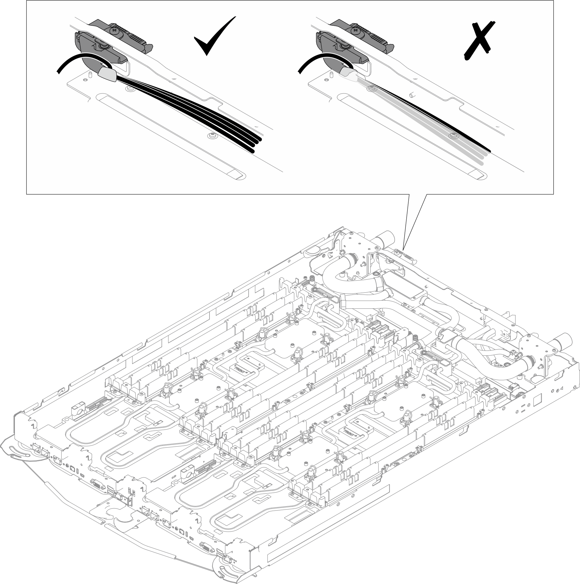 케이블을 냉각판 위에 약간 위에 유지하십시오. 냉각판과 트레이 벽 사이의 틈에 케이블을 삽입하지 마십시오.