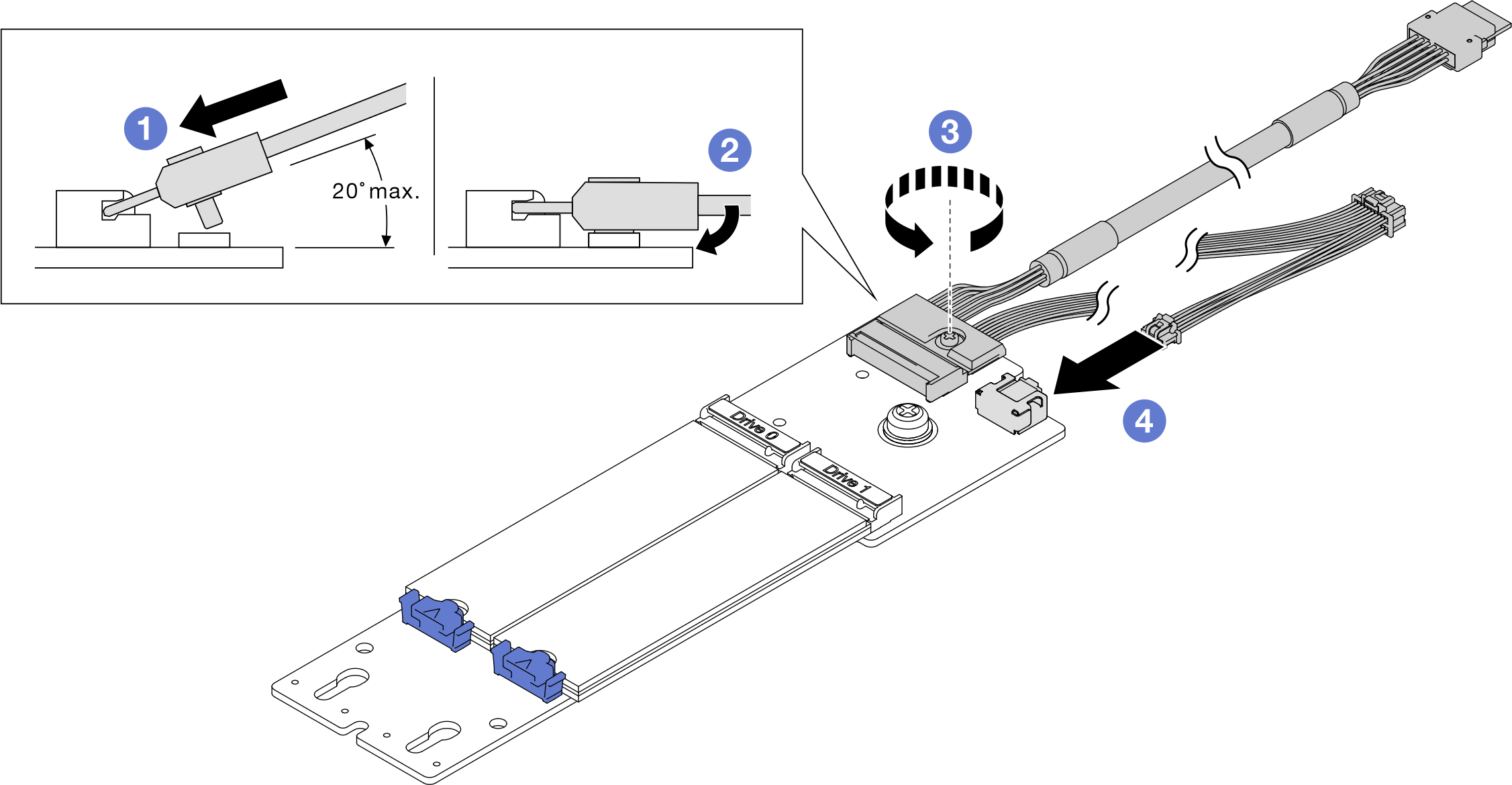硬件更换过程更换 PCIe 扩展托盘中的组件更换 M.2 硬盘和背板安装 M.2 硬盘和背板支架组合件安装 M.2 硬盘和背板支架组合件按照本节中的说明安装 M.2 硬盘和背板支架组合件。关于本任务注意请仔细阅读安装准则,以在工作时确保安全。将装有组件的防静电包装与服务器上任何未上漆的金属表面接触;然后从包装中取出组件,并将其放置在防静电表面。过程如果已安装 7 毫米硬盘仓,请先将其卸下(请参阅卸下 7 毫米硬盘仓)。如有必要,将 M.2 硬盘装入背板。图 1. 安装 M.2 硬盘 将 M.2 硬盘与接口对齐。 将 M.2 硬盘的另一端朝着背板旋转。 向前滑动固定夹,将硬盘固定至背板。如果适用,请将线缆连接到 M.2 背板。图 2. 将线缆连接到 M.2 背板 将接口倾斜至少 20 度,然后将其插入,直至底部表面接触到斜面。 将接口向下按平。 拧紧信号线缆上的螺钉。 连接电源线。如果适用,将 M.2 背板安装到支架。图 3. 将 M.2 背板安装到支架 将背板背面的插槽与支架上的后部销钉对齐,然后降低背板的另一侧。 将背板上的松不脱螺钉与支架上的前部销钉对齐。 用螺丝刀拧紧松不脱螺钉,将背板固定到支架。将 M.2 背板的一端与 PCIe 扩展托盘上的插槽对齐,然后将另一端朝着该托盘旋转,直至支架“咔嗒”一声锁定到位。图 4. 将 M.2 背板支架组合件将 M.2 信号线缆和电源线连接到主板。图 5. M.2 硬盘线缆布放1 M.2 PCIe 接口2 M.2 背板电源接口完成本任务之后继续完成部件更换(请参阅完成部件更换)。演示视频在 YouTube 上观看操作过程提供反馈