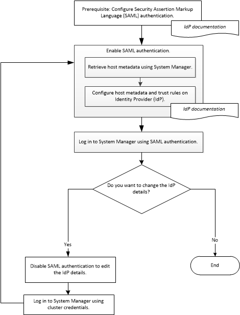 You can set up Security Assertion Markup Language (SAML) authentication so that remote users are authenticated through a secure identity provider (IdP) before they log in to Storage Manager.