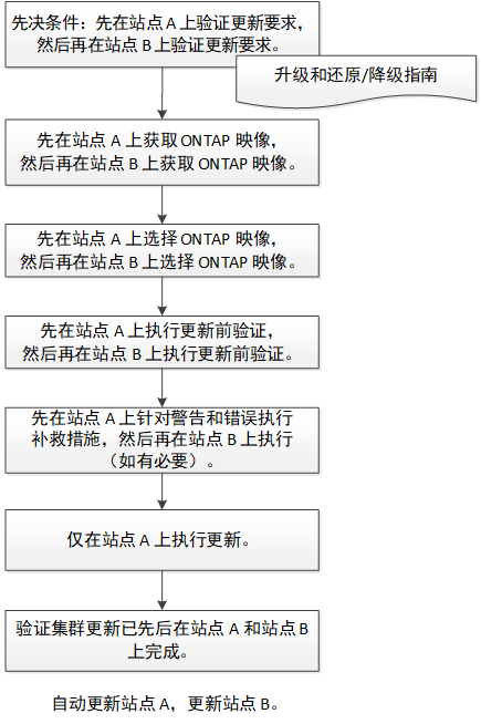 管理集群更新集群在 MetroCluster 配置中更新集群在 MetroCluster 配置中更新集群可使用 Storage Manager 在 MetroCluster 配置中更新集群。除了更新集群之外,每项操作必须针对两个集群均执行。相关信息升级、还原或降级指南提供反馈