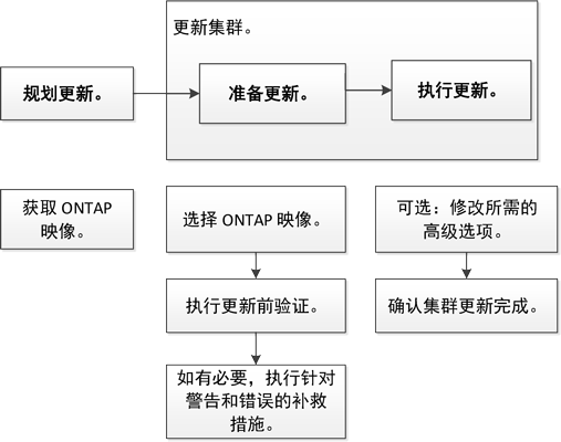 管理集群更新集群在非 MetroCluster 配置中更新集群在非 MetroCluster 配置中更新集群可以使用 Storage Manager 更新集群,或高可用性(HA)对中的各个节点。要执行更新,应先选择一个 ONTAP 映像,并验证集群或 HA 对中的各个节点是否已准备好进行更新,然后再执行更新。相关信息升级、还原或降级指南提供反馈