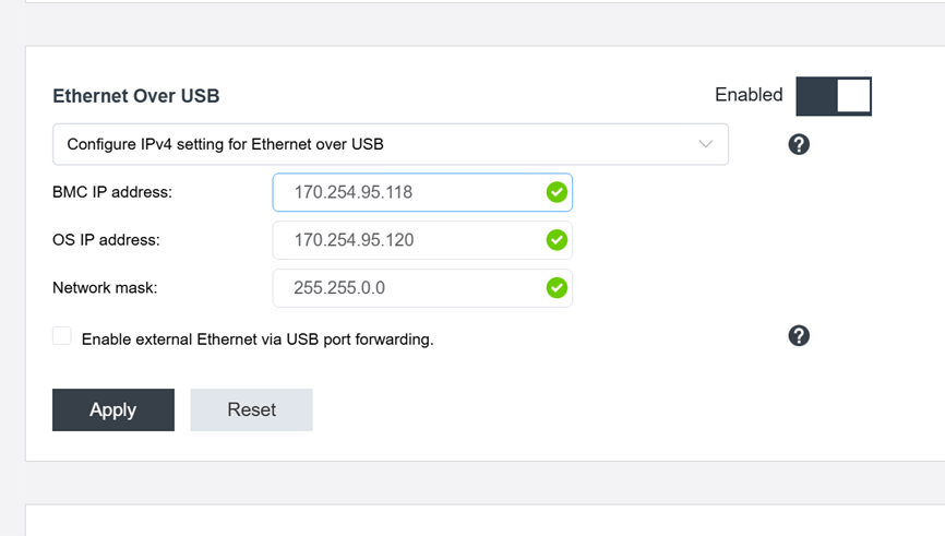 4. Navigate back to the BMC configuration section in the XCC web portal, navigate to the Ethernet over USB settings under the Networking section and copy the following settings, including each specific IP address for BMC (170.254.95.118) and OS (170.254.95.120).