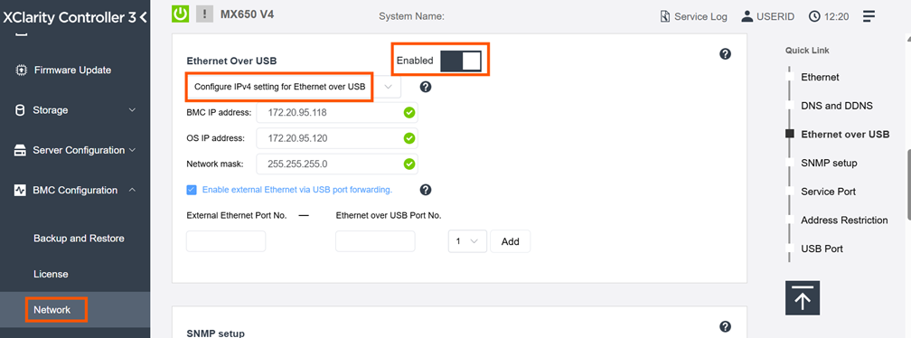 4. Navigate back to the BMC configuration section in the XCC web portal, navigate to the Ethernet over USB settings under the Networking section and copy the following settings, including each specific IP address for BMC (170.254.95.118) and OS (170.254.95.120).