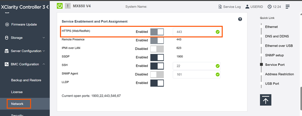 4. While still on the Network pane, scroll down to the Service Enablement and Port Assignment settings to ensure that HTTPS (Web/Redfish) is Enabled. This is the default setting but should be verified.